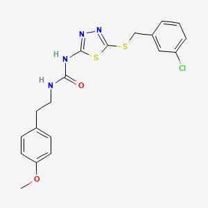 1-(5-((3-Chlorobenzyl)thio)-1,3,4-thiadiazol-2-yl)-3-(4-methoxyphenethyl)urea is a urea derivative featuring a 1,3,4-thiadiazole core substituted with a 3-chlorobenzylthio group and a 4-methoxyphenethyl urea moiety.