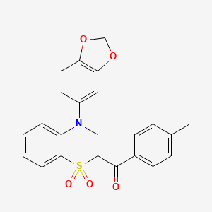 This compound belongs to the benzothiazinone class, characterized by a 1,4-benzothiazine-1,1-dioxide core substituted with a 1,3-benzodioxole moiety at position 4 and a 4-methylphenyl methanone group at position 2. The 4-methylphenyl methanone substituent contributes to lipophilicity, influencing pharmacokinetic properties such as membrane permeability and metabolic stability .
