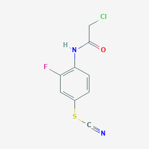 The mechanism of action of 2-chloro-N-[4-(cyanosulfanyl)-2-fluorophenyl]acetamide involves its interaction with specific molecular targets. The chloroacetamide group can act as an electrophile, reacting with nucleophilic sites on proteins or enzymes. This interaction can lead to the inhibition of enzyme activity or modification of protein function. The cyanosulfanyl group may also contribute to the compound’s reactivity and binding affinity to biological targets.