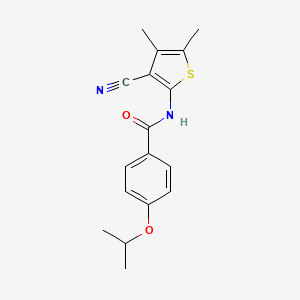 N-(3-Cyano-4,5-dimethylthiophen-2-yl)-4-isopropoxybenzamide is a heterocyclic compound featuring a thiophene ring substituted with cyano (-CN) and dimethyl (-CH₃) groups at the 3-, 4-, and 5-positions, respectively. The benzamide moiety includes a 4-isopropoxy substituent, which may enhance lipophilicity and influence binding interactions.