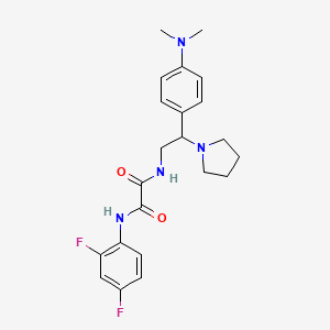 N1-(2,4-Difluorophenyl)-N2-(2-(4-(dimethylamino)phenyl)-2-(pyrrolidin-1-yl)ethyl)oxalamide is a synthetic oxalamide derivative characterized by its bifunctional aromatic and aliphatic substituents. The compound features a 2,4-difluorophenyl group on one amide nitrogen and a complex ethyl-linked moiety on the other, combining a 4-(dimethylamino)phenyl group and a pyrrolidine ring. Its design aligns with trends in oxalamide-based compounds, which are often explored for their receptor-binding capabilities, metabolic stability, and tunable physicochemical properties .