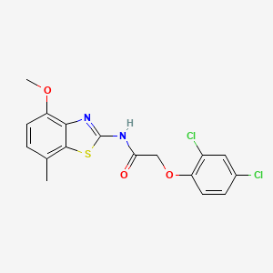 2-(2,4-Dichlorophenoxy)-N-(4-methoxy-7-methyl-1,3-benzothiazol-2-yl)acetamide is a synthetic small molecule characterized by a 2,4-dichlorophenoxy group linked to an acetamide scaffold, which is further substituted with a 4-methoxy-7-methyl-1,3-benzothiazole moiety. The dichlorophenoxy group is a common motif in agrochemicals and pharmaceuticals, conferring lipophilicity and bioactivity, while the benzothiazole ring system is known for its role in enzyme inhibition and receptor binding .