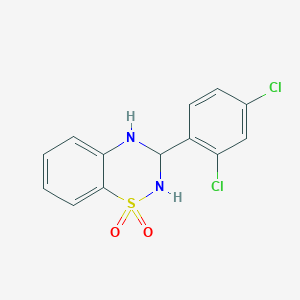 The synthesis of 3-(2,4-dichlorophenyl)-3,4-dihydro-2H-1lambda6,2,4-benzothiadiazine-1,1-dione typically involves the reaction of 2,4-dichlorophenylamine with a suitable thiadiazine precursor under controlled conditions. The reaction is often carried out in the presence of a catalyst and under an inert atmosphere to prevent unwanted side reactions. The temperature and pressure conditions are carefully monitored to ensure the desired product is obtained with high yield and purity .