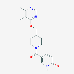 5-(4-(((5,6-dimethylpyrimidin-4-yl)oxy)methyl)piperidine-1-carbonyl)pyridin-2(1H)-one is a synthetic organic compound characterized by its complex structure and multifunctional groups. With applications spanning various scientific fields, this compound is of significant interest to researchers and industrial chemists.