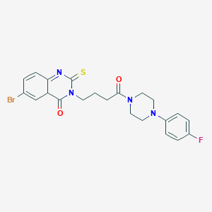6-Bromo-3-{4-[4-(4-fluorophenyl)piperazin-1-yl]-4-oxobutyl}-2-sulfanylidene-1,2,3,4-tetrahydroquinazolin-4-one is a complex organic compound that incorporates both a quinazoline core and a piperazine moiety. This structure suggests potential biological activities, particularly in the fields of neuropharmacology and oncology. The presence of the fluorine atom in the piperazine ring enhances its lipophilicity and may improve receptor interactions.