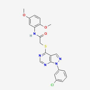 This compound belongs to the pyrazolo[3,4-d]pyrimidine class, a scaffold known for its structural resemblance to purines and diverse pharmacological activities, including kinase inhibition and antitumor properties . The molecule features a 3-chlorophenyl group at the pyrazolo[3,4-d]pyrimidine N1-position, a thioether-linked acetamide bridge, and a 2,5-dimethoxyphenyl substituent. These functional groups likely influence its solubility, target binding, and metabolic stability compared to analogs.
