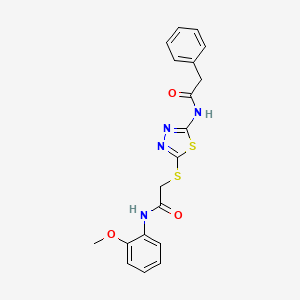 N-(2-Methoxyphenyl)-2-((5-(2-phenylacetamido)-1,3,4-thiadiazol-2-yl)thio)acetamide is a heterocyclic compound featuring a 1,3,4-thiadiazole core substituted with a 2-phenylacetamido group at position 5 and a thioether-linked acetamide moiety at position 2. The acetamide chain terminates in a 2-methoxyphenyl group, introducing electron-donating methoxy functionality. This structural framework is characteristic of bioactive thiadiazole derivatives, which are frequently explored for antimicrobial, anticancer, and enzyme-inhibitory properties due to their ability to participate in hydrogen bonding and π-π interactions .