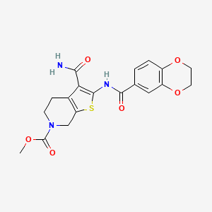 InChI=1S/C19H19N3O6S/c1-26-19(25)22-5-4-11-14(9-22)29-18(15(11)16(20)23)21-17(24)10-2-3-12-13(8-10)28-7-6-27-12/h2-3,8H,4-7,9H2,1H3,(H2,20,23)(H,21,24) | |