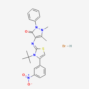 (Z)-4-((3-(tert-butyl)-4-(3-nitrophenyl)thiazol-2(3H)-ylidene)amino)-1,5-dimethyl-2-phenyl-1H-pyrazol-3(2H)-one hydrobromide (CAS Number: 352018-54-3) is a synthetic compound characterized by a complex structure that integrates multiple pharmacophoric elements. This compound is of interest due to its potential biological activities, particularly in the fields of medicinal chemistry and pharmacology.
