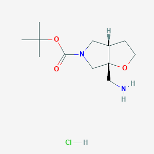 Tert-butyl (3aS,6aR)-6a-(aminomethyl)-3,3a,4,6-tetrahydro-2H-furo[2,3-c]pyrrole-5-carboxylate;hydrochloride is a bicyclic compound featuring a fused furo[2,3-c]pyrrole core. The molecule comprises a tert-butyl carbamate group at the 5-position, an aminomethyl substituent at the 6a position, and a hydrochloride salt to enhance stability and solubility. The furo[2,3-c]pyrrole scaffold is a privileged structure in medicinal chemistry due to its rigidity and ability to mimic peptide turn motifs, making it valuable in drug discovery .