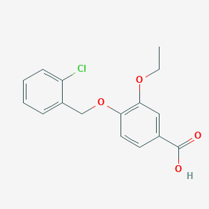 The synthesis of 4-[(2-Chlorobenzyl)oxy]-3-ethoxybenzoic acid typically involves the reaction of 4-hydroxy-3-ethoxybenzoic acid with 2-chlorobenzyl chloride in the presence of a base such as potassium carbonate. The reaction is carried out in an organic solvent like dimethylformamide (DMF) at elevated temperatures to facilitate the formation of the ether linkage .