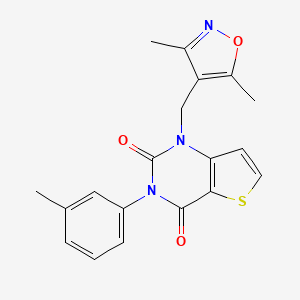 This compound belongs to the thieno[3,2-d]pyrimidine-2,4-dione class, characterized by a fused thiophene-pyrimidine core with a dione moiety at positions 2 and 2. The substituents include a 3,5-dimethylisoxazole methyl group at position 1 and a 3-methylphenyl group at position 3. The synthesis likely follows methods analogous to those described for related thieno[2,3-d]pyrimidin-4(3H)-ones, involving condensation of substituted oxazine-diones with aldehydes and amines under basic conditions .
