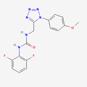 1-(2,6-Difluorophenyl)-3-((1-(4-methoxyphenyl)-1H-tetrazol-5-yl)methyl)urea is a urea derivative featuring a 2,6-difluorophenyl group and a tetrazole moiety linked via a methylene bridge to a 4-methoxyphenyl substituent. The 2,6-difluorophenyl group is known to enhance metabolic stability and binding affinity in medicinal chemistry, while the tetrazole ring contributes to hydrogen bonding and aromatic interactions due to its planar, electron-rich structure . The 4-methoxyphenyl group introduces electron-donating properties, which may improve solubility compared to halogenated analogs .
