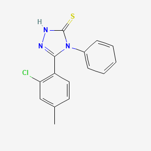 5-(2-Chloro-4-methylphenyl)-4-phenyl-4H-1,2,4-triazole-3-thiol is a triazole-based heterocyclic compound characterized by a 1,2,4-triazole core substituted with a phenyl group at position 4 and a 2-chloro-4-methylphenyl group at position 5, along with a thiol (-SH) functional group at position 2. The presence of chlorine and methyl groups on the aromatic ring introduces steric and electronic effects that influence its chemical reactivity, solubility, and biological activity. Triazole derivatives are widely studied for their antimicrobial, antifungal, and anticancer properties due to their ability to interact with biological targets such as enzymes and receptors .