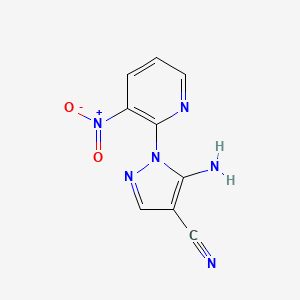 5-Amino-1-(3-nitropyridin-2-yl)-1H-pyrazole-4-carbonitrile (CAS: 956754-94-2; molecular formula: C₉H₆N₆O₂) is a pyrazole-4-carbonitrile derivative featuring a 3-nitropyridinyl substituent at the 1-position of the pyrazole ring . This compound is structurally characterized by: