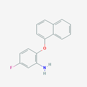 5-Fluoro-2-(1-naphthyloxy)aniline is a fluorinated aniline derivative featuring a fluorine atom at the 5-position and a 1-naphthyloxy group at the 2-position of the benzene ring. The compound’s structure combines aromatic hydrophobicity (from the naphthalene moiety) with the electronic effects of fluorine, making it a candidate for medicinal chemistry and material science applications. Its instability in diamine form necessitates immediate use in subsequent reactions .