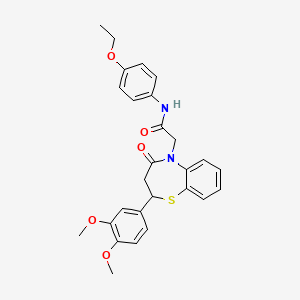 This compound belongs to the 1,5-benzothiazepine class, characterized by a seven-membered heterocyclic ring containing sulfur and nitrogen. Its structure includes a 3,4-dimethoxyphenyl substituent at position 2 and a 4-ethoxyphenyl acetamide group at position 5, which contribute to its unique physicochemical and bioactive properties.