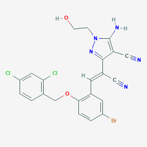 C1=CC(=C(C=C1Cl)Cl)COC2=C(C=C(C=C2)Br)C=C(C#N)C3=NN(C(=C3C#N)N)CCO |