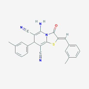 The synthesis of (2Z)-5-AMINO-7-(3-METHYLPHENYL)-2-[(3-METHYLPHENYL)METHYLIDENE]-3-OXO-2H,3H,7H-[1,3]THIAZOLO[3,2-A]PYRIDINE-6,8-DICARBONITRILE typically involves multi-step organic reactions. One common method involves the condensation of 3-methylbenzaldehyde with 2-amino-3-cyano-4,6-dimethylpyridine in the presence of a base, followed by cyclization with thiourea under acidic conditions. The reaction is usually carried out in a solvent such as ethanol or methanol, and the product is purified by recrystallization .