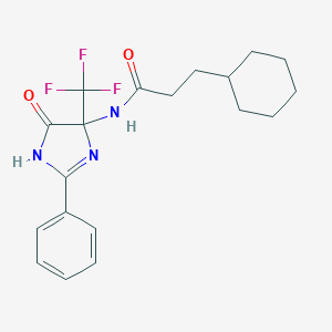 The synthesis of 3-cyclohexyl-N-[5-oxo-2-phenyl-4-(trifluoromethyl)-4,5-dihydro-1H-imidazol-4-yl]propanamide typically involves multiple steps. The process begins with the preparation of the imidazole ring, followed by the introduction of the phenyl and trifluoromethyl groups. The final step involves the attachment of the cyclohexyl group and the propanamide moiety. Specific reaction conditions, such as temperature, solvents, and catalysts, are crucial for the successful synthesis of this compound .