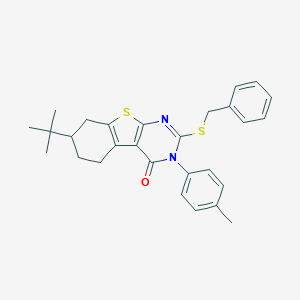 The synthesis of 2-Benzylsulfanyl-7-tert-butyl-3-(4-methylphenyl)-5,6,7,8-tetrahydro-1benzothiolo[2,3-d]pyrimidin-4-one typically involves multi-step organic reactions. One common method involves the condensation of appropriate benzyl and tert-butyl derivatives with a thiol-containing pyrimidine precursor. The reaction conditions often require the use of solvents like dimethylformamide (DMF) and catalysts such as triethylamine. The reaction mixture is usually heated under reflux to facilitate the formation of the desired product .