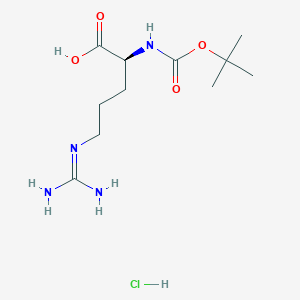 Boc-Arg-OH.HCl is synthesized through the protection of the amino group in arginine with a tert-butoxycarbonyl (Boc) group. This protection enhances the stability and solubility of arginine in organic solvents, making it suitable for peptide synthesis. The compound has a molecular formula of C₁₁H₂₃ClN₄O₄ and a molecular weight of 292.79 g/mol .