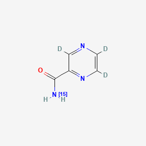 Pyrazinamide-<sup>15</sup>N,d3 is typically synthesized via isotopic labeling of pyrazinamide using <sup>15</sup>N-enriched precursors and deuterated reagents. Key steps include: