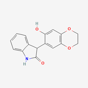 The mechanism by which 3-(7-Hydroxy-2,3-dihydrobenzo[b][1,4]dioxin-6-yl)indolin-2-one exerts its effects is not fully understood. it is believed to interact with specific molecular targets, such as enzymes or receptors, through hydrogen bonding, hydrophobic interactions, and π-π stacking. These interactions can modulate the activity of the target molecules, leading to various biological effects. Further research is needed to elucidate the precise pathways and molecular targets involved .