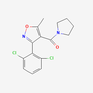 The synthesis of 3-(2,6-dichlorophenyl)-5-methyl-4-(pyrrolidine-1-carbonyl)-1,2-oxazole typically involves multiple steps. One common method involves the reaction of 2,6-dichlorobenzoyl chloride with 5-methyl-4-(pyrrolidine-1-carbonyl)-1,2-oxazole in the presence of a base such as triethylamine. The reaction is usually carried out in an organic solvent like dichloromethane at room temperature. After the reaction is complete, the product is purified using column chromatography .