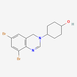 The molecular structure of this compound consists of a quinazoline ring system substituted with two bromine atoms and linked to a cyclohexanol moiety. The compound's International Union of Pure and Applied Chemistry name is 4-(6,8-dibromo-4H-quinazolin-3-yl)cyclohexan-1-ol, reflecting its systematic nomenclature based on the quinazoline core structure. The molecular formula is established as C₁₄H₁₆Br₂N₂O with a corresponding molecular weight of 388.1 g/mol.