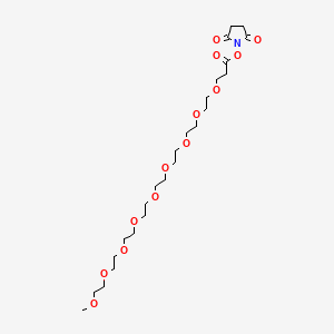 m-PEG9-NHS ester is a monofunctional, discrete polyethylene glycol (dPEG®) reagent widely utilized in bioconjugation, drug delivery, and proteomics. This crosslinker consists of a methoxy-terminated polyethylene glycol chain of nine ethylene glycol units, functionalized with an N-hydroxysuccinimide (NHS) ester. The NHS ester group provides reactivity towards primary amines (-NH2) present on proteins, peptides, antibodies, and other biomolecules, forming stable amide bonds. The hydrophilic PEG spacer enhances the solubility and bioavailability of the conjugated molecule, reduces immunogenicity, and provides a flexible linker arm.[1] This guide provides a comprehensive overview of the technical properties, applications, and detailed experimental protocols for the effective use of this compound.