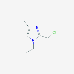 2-(Chloromethyl)-1-ethyl-4-methyl-1H-imidazole is a substituted imidazole derivative characterized by a chloromethyl (-CH2Cl) group at position 2, an ethyl (-CH2CH3) group at position 1, and a methyl (-CH3) group at position 4 of the imidazole ring. This structure imparts unique reactivity, particularly in nucleophilic substitution reactions, due to the electron-withdrawing chlorine atom and the steric effects of the ethyl and methyl substituents. Such compounds are often intermediates in pharmaceuticals, agrochemicals, or materials science due to their versatility in further functionalization .
