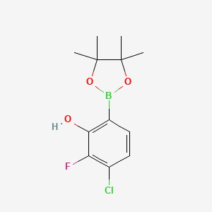 4-Chloro-3-fluoro-2-hydroxyphenylboronic acid pinacol ester is a boronic acid derivative with a pinacol ester protecting group. Its structure features a phenyl ring substituted with chlorine (position 4), fluorine (position 3), and a hydroxyl group (position 2), coupled with the pinacol boronate moiety.