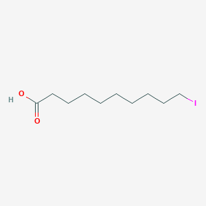 10-Iododecanoic acid (chemical formula: C₁₀H₁₉IO₂) is a long-chain fatty acid derivative featuring an iodine atom at the 10th carbon position. This structural modification enhances its utility in organic synthesis, particularly in radical reactions and as a precursor for lipid-based biomaterials. For example, iodinated fatty acids like iodoacetic acid (C₂H₃IO₂) are well-documented for their role in alkylation reactions and biochemical studies .