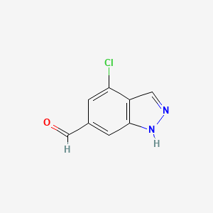 4-Chloro-1H-indazole-6-carbaldehyde is a heterocyclic aromatic compound featuring an indazole core substituted with a chlorine atom at position 4 and a carbaldehyde group at position 5. Indazole derivatives are of significant interest in medicinal chemistry due to their structural versatility and bioactivity. The chloro and aldehyde substituents enhance reactivity, making this compound a valuable intermediate in synthesizing pharmaceuticals, agrochemicals, and coordination complexes.