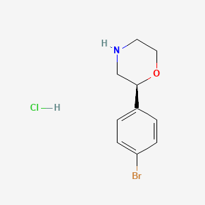 The synthesis of (2S)-2-(4-bromophenyl)morpholine;hydrochloride typically involves the reaction of 4-bromophenylamine with an appropriate morpholine derivative under controlled conditions. The reaction is usually carried out in the presence of a suitable catalyst and solvent to facilitate the formation of the desired product. The reaction conditions, such as temperature and reaction time, are optimized to achieve high yield and purity.