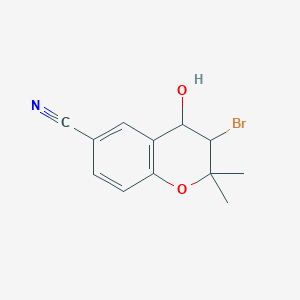 3-Bromo-4-hydroxy-2,2-dimethyl-3,4-dihydrochromene-6-carbonitrile: is an organic compound with the molecular formula C12H12BrNO2. It is a derivative of chromane, a bicyclic structure consisting of a benzene ring fused to a tetrahydropyran ring. The presence of bromine, hydroxyl, and nitrile groups in its structure makes it a versatile compound in various chemical reactions and applications.