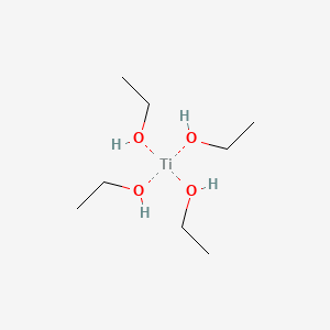 This technical guide provides a comprehensive overview of the synthesis of titanium(IV) ethoxide from titanium tetrachloride. This compound is a critical precursor in the synthesis of various titanium-based compounds and materials, finding applications in catalysis, materials science, and pharmaceutical development. This document details the core chemical principles, experimental protocols, safety considerations, and data for the synthesis of this important alkoxide. The primary synthetic route discussed is the reaction of titanium tetrachloride with ethanol (B145695) in the presence of a base to neutralize the hydrogen chloride byproduct. Both triethylamine (B128534) and ammonia (B1221849) are presented as viable bases for this reaction. This guide is intended to provide researchers and professionals with the necessary information to safely and efficiently synthesize and handle this compound.