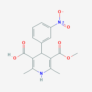 The compound, with the molecular formula C₁₆H₁₆N₂O₆ (MW: 332.31 g/mol), is a 1,4-dihydropyridine (DHP) derivative featuring a methoxycarbonyl group at position 5, a carboxylic acid at position 3, and a 3-nitrophenyl substituent at position 4 . It is a key intermediate in synthesizing calcium channel blockers like barnidipine hydrochloride, an antihypertensive agent .