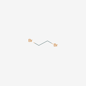 this compound (C₂H₄Br₂) is a halogenated alkane with two bromine atoms in a vicinal configuration (Br–CH₂–CH₂–Br). Its molecular weight is 187.86 g/mol, with a boiling point of 131–132°C and melting point of 9.8°C . The molecule’s symmetry and high electronegativity of bromine atoms influence its reactivity in nucleophilic substitution (e.g., SN2 reactions) and elimination reactions. Key parameters for experimental design include its moderate water solubility (0.4 g/100 mL at 20°C) and vapor pressure (11.4 mmHg at 25°C), which necessitate sealed systems to prevent volatilization during synthesis or toxicity studies .