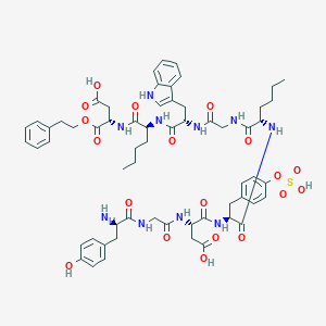 CCCC[C@@H](C(=O)NCC(=O)N[C@@H](CC1=CNC2=CC=CC=C21)C(=O)N[C@@H](CCCC)C(=O)N[C@@H](CC(=O)O)C(=O)OCCC3=CC=CC=C3)NC(=O)[C@H](CC4=CC=C(C=C4)OS(=O)(=O)O)NC(=O)[C@H](CC(=O)O)NC(=O)CNC(=O)[C@@H](CC5=CC=C(C=C5)O)N |