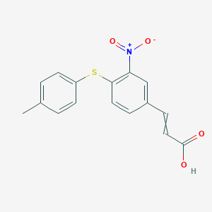 - 3-(3-Nitro-4-(p-tolylthio)phenyl)acrylic acid can be utilized in the development of functional polymers. Its incorporation into polymer matrices can impart unique properties such as increased thermal stability and improved mechanical characteristics. Studies indicate that polymers derived from this compound exhibit enhanced performance in applications ranging from coatings to biomedical devices .