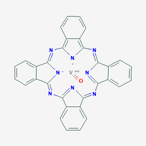 Oxo(29H,31H-phthalocyaninato(2-)-N29,N30,N31,N32)vanadium, also known as vanadium(IV) phthalocyanine oxide (VOPc), is a metallophthalocyanine complex with the molecular formula C32H16N8OV and a molecular weight of 579.46 g/mol . Structurally, it consists of a vanadium(IV) ion coordinated to a phthalocyanine macrocycle via four nitrogen atoms, with an axial oxo ligand (V=O). The compound is a blue powder with a dye content exceeding 90% and exhibits a strong absorption maximum at 701 nm (λmax), characteristic of its π-π* transitions . VOPc is utilized in niche applications such as organic semiconductors, photoconductive materials (e.g., Xerox xpp-VOPc), and near-infrared (NIR) dyes .