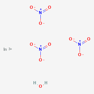 Indium(III) nitrate, a salt of indium and nitric acid, is a versatile compound available in various hydrated forms, most notably as a trihydrate and a pentahydrate.[1] These compounds serve as crucial precursors in the synthesis of indium-based materials, such as indium oxide, which is vital for transparent conductive films in electronics and solar cells.[2] Their applications extend to catalysis and organic synthesis, where they function as effective Lewis acids.[2] In the biomedical field, indium compounds are being explored for their potential in drug delivery systems and as therapeutic agents. Understanding the distinct properties of the different hydrate (B1144303) forms is essential for their effective application in research and development.