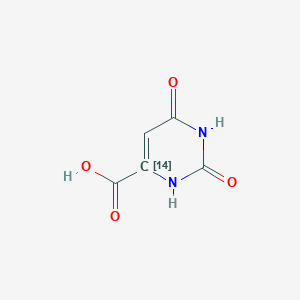 2,4-Dioxo-(614C)1H-pyrimidine-6-carboxylic acid is a pyrimidine derivative featuring oxo groups at positions 2 and 4, a carboxylic acid moiety at position 6, and a carbon-14 isotopic label at position 6 (denoted as 614C). This isotopic labeling is critical for metabolic tracing studies in pharmaceutical research. The presence of multiple electron-withdrawing groups (oxo and carboxylic acid) enhances its reactivity and binding affinity to biological targets, making it a promising candidate for drug development.