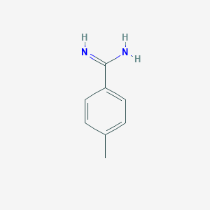 4-Methyl-benzamidine, also known as p-Toluamidine or 4-Methyl-benzamidin, is an aromatic imine derivative characterized by a benzamidine core substituted with a methyl group at the para position of the benzene ring. It is primarily utilized in chemical synthesis and pharmaceutical research due to its role as a precursor or intermediate in organic reactions. Key physical properties include a boiling point of 225°C (at 7 mmHg), density of 1.07 g/cm³, and refractive index of 1.559 . Commercial suppliers offer it in varying purities (e.g., 95–98%) for laboratory use, highlighting its relevance in industrial and academic settings .