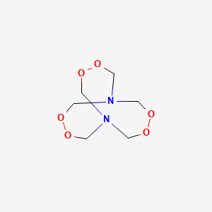 HMTD has a detonation velocity of 4,511 m/s at 0.88 g/cm³ and a relative brisance of 0.35, comparable to primary explosives like mercury fulminate . Its sensitivity to friction, shock, and heat (decomposes >75°C) necessitates inert handling environments. The compound’s peroxide bridges contribute to instability, with spontaneous decomposition observed during long-term storage .