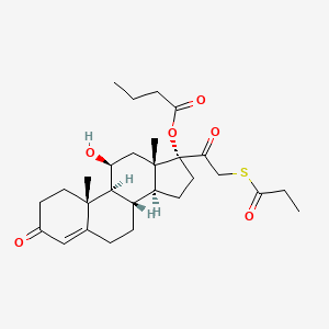 this compound is a glucocorticoid pro-drug designed for localized activation in the lung, minimizing systemic side effects. Its activation involves non-enzymatic migration of the propionyl group from the 17α- to the 21-position, followed by esterase-catalyzed hydrolysis to release the active corticosteroid . Methodologically, preclinical studies should employ in vitro models (e.g., lung tissue homogenates) to assess esterase activity and in vivo rodent models to evaluate lung-specific bioavailability. Pharmacokinetic (PK) studies in rats, as described by Chanoine et al. (1991), provide a template for intratracheal vs. systemic administration comparisons .