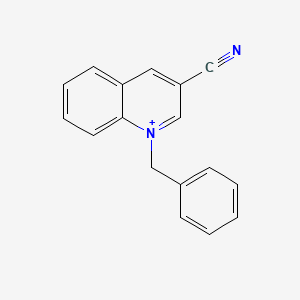 The molecular structure of quinolinium, 3-cyano-1-(phenylmethyl)- exhibits a complex arrangement of functional groups that significantly influence its chemical behavior and properties. The compound features a quinolinium core, which consists of a fused benzene-pyridine ring system bearing a positive charge on the nitrogen atom. This cationic nature fundamentally alters the electronic distribution within the molecule compared to neutral quinoline derivatives.