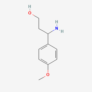 This compound is a β-amino alcohol, meaning the amino and hydroxyl groups are separated by two carbon atoms. Its structure consists of a three-carbon propanol (B110389) backbone. A primary alcohol (-OH) group is located at the first carbon (C1), while a primary amino (-NH2) group and a 4-methoxyphenyl (B3050149) group are attached to the third carbon (C3). The 4-methoxyphenyl group is a benzene (B151609) ring substituted with a methoxy (B1213986) (-OCH3) group at the para position. The presence of a chiral center at the C3 carbon, which is bonded to four different groups (the amino group, the 4-methoxyphenyl group, the C2 of the propane (B168953) chain, and a hydrogen atom), means that this compound can exist as two distinct enantiomers: (R)- and (S)-3-Amino-3-(4-methoxyphenyl)propan-1-ol.